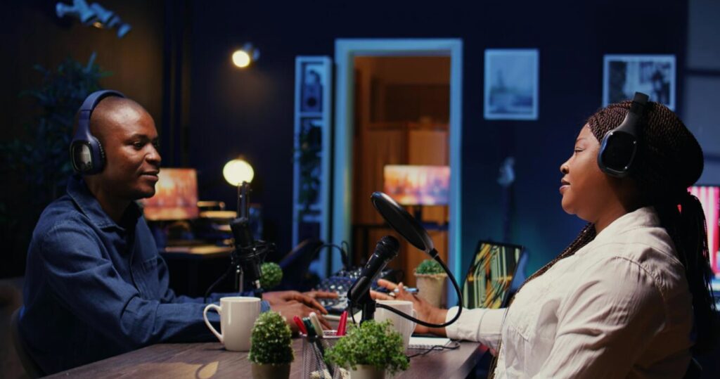 The studio is equipped with professional 4K cameras, microphones, headphones, a teleprompter, TV screens, mixers, and lighting systems to ensure broadcast-quality output. Advanced recording tools deliver clear audio and high-resolution visuals. This setup supports both video and audio podcast formats with consistent quality.
